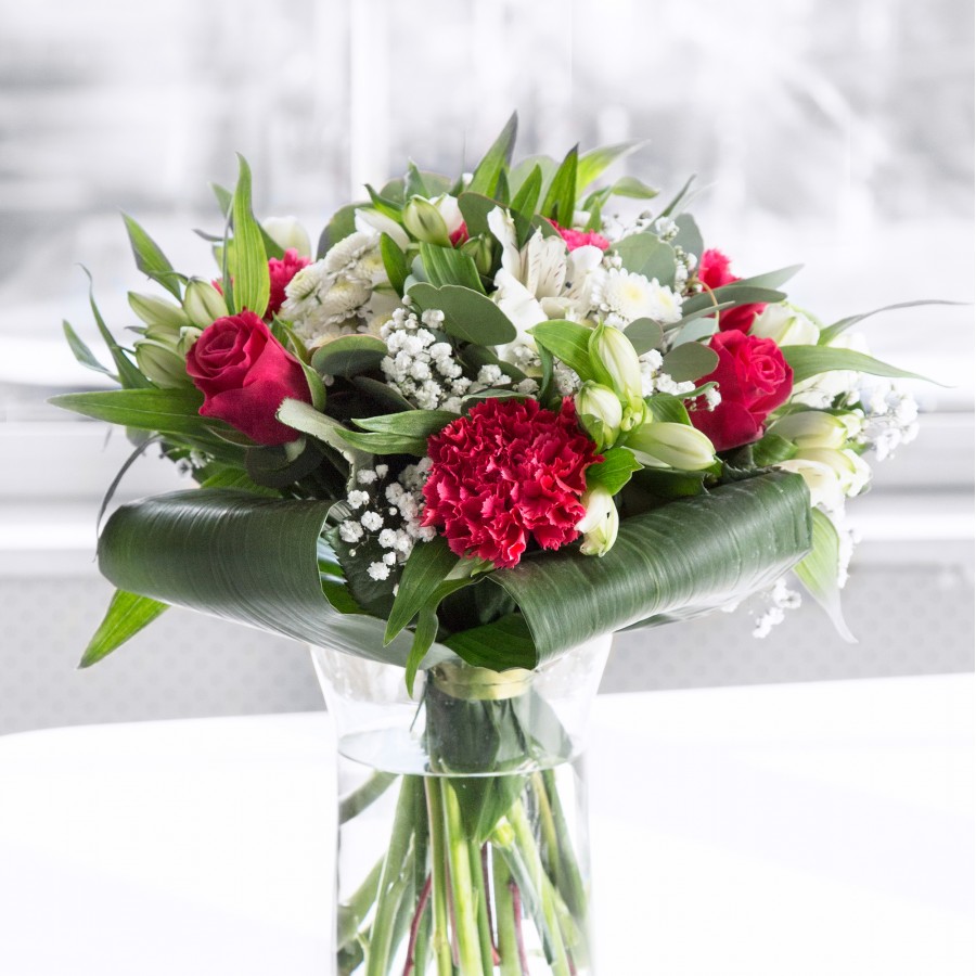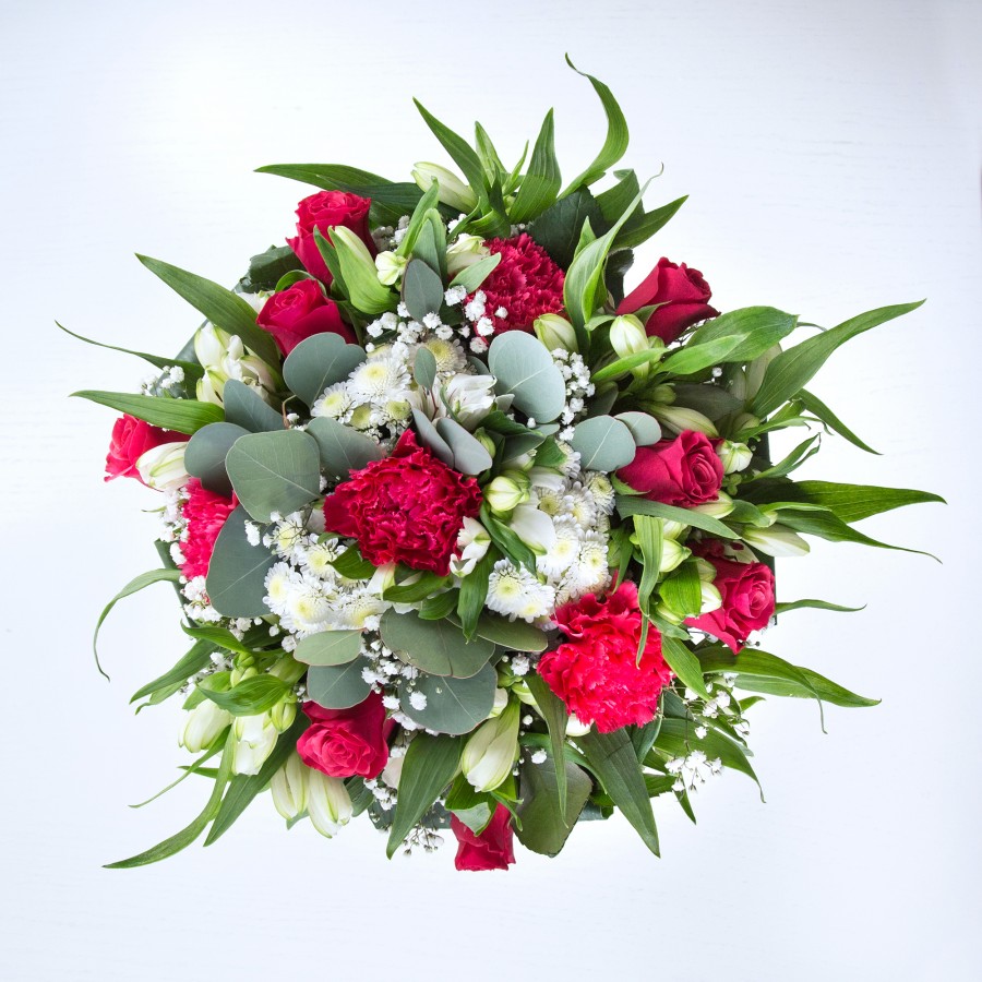 Immerse yourself in the captivating beauty of our exclusive bouquet. This arrangement showcases a harmonious blend of vibrant red roses, delicate white chrysanthemums, and lush carnations, all meticulously hand-selected to ensure unparalleled freshness.
