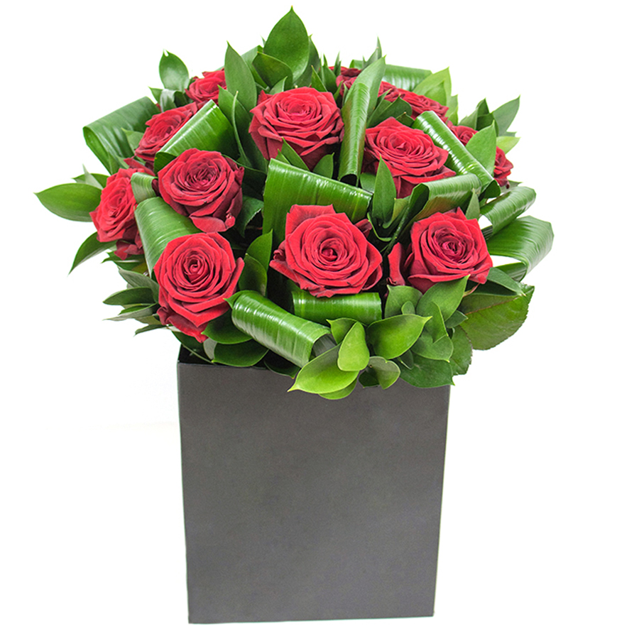 Bring style and sophistication to any home with our stunning bouquet of red roses, aspidistra leaves, and ruscus.