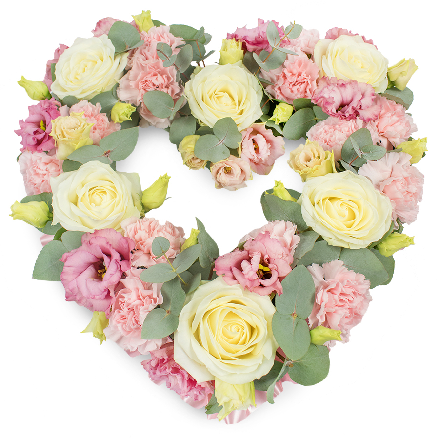 Our exquisite floral arrangement is designed to honor memories with a touch of elegance. Featuring a refined blend of white roses, soft pink carnations, charming pink lisianthus, and accented with eucalyptus leaves, this bouquet is a symphony of colors and textures. Every flower is carefully chosen at peak freshness and hand-arranged to ensure a stunning presentation.